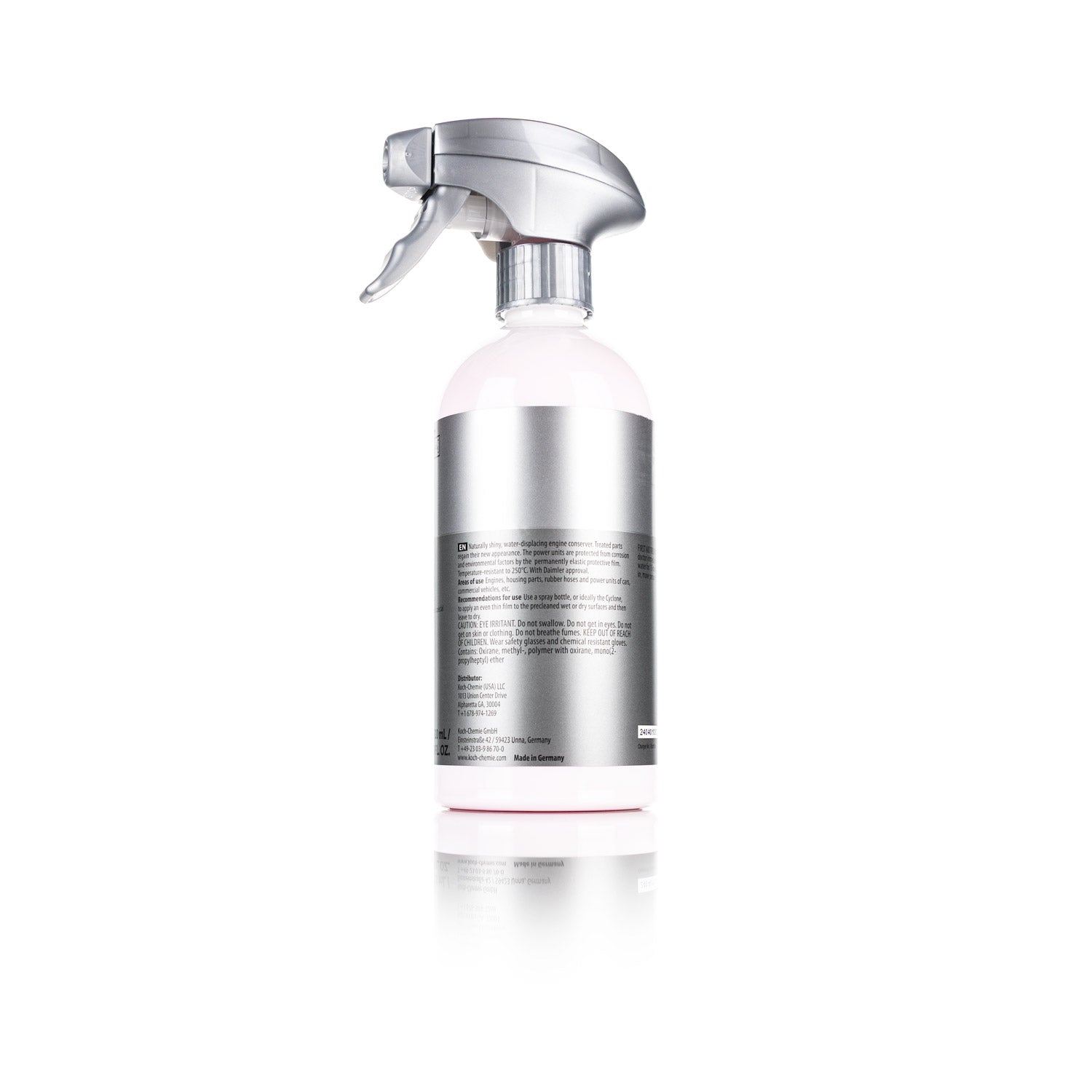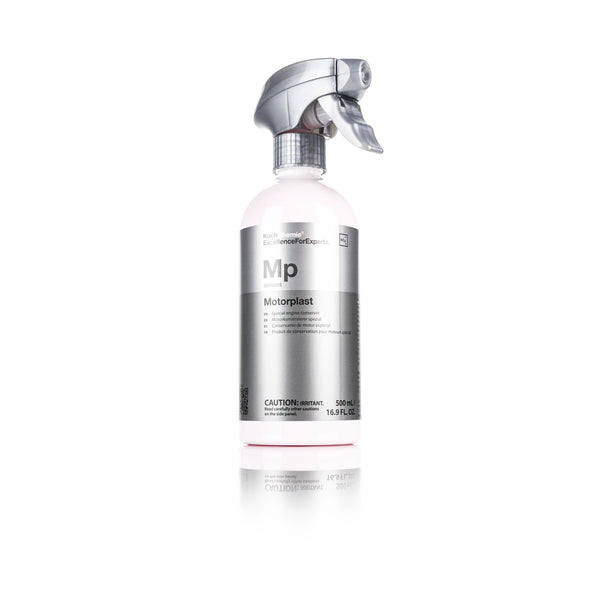 Koch Chemie Motorplast is a naturally shiny, water-displacing conserver for engines, housing parts, rubber hoses and power units of cars, commercial vehicles, etc., with a pleasant fragrance. Treated parts regain their new appearance. The complete drying (no lubricating film) prevents dirt sticking. The power units are protected from corrosion and environmental factors by the permanently elastic protective film. Motorplast is suitable for use on dry and wet surfaces. Temperature-resistant to 250°C.