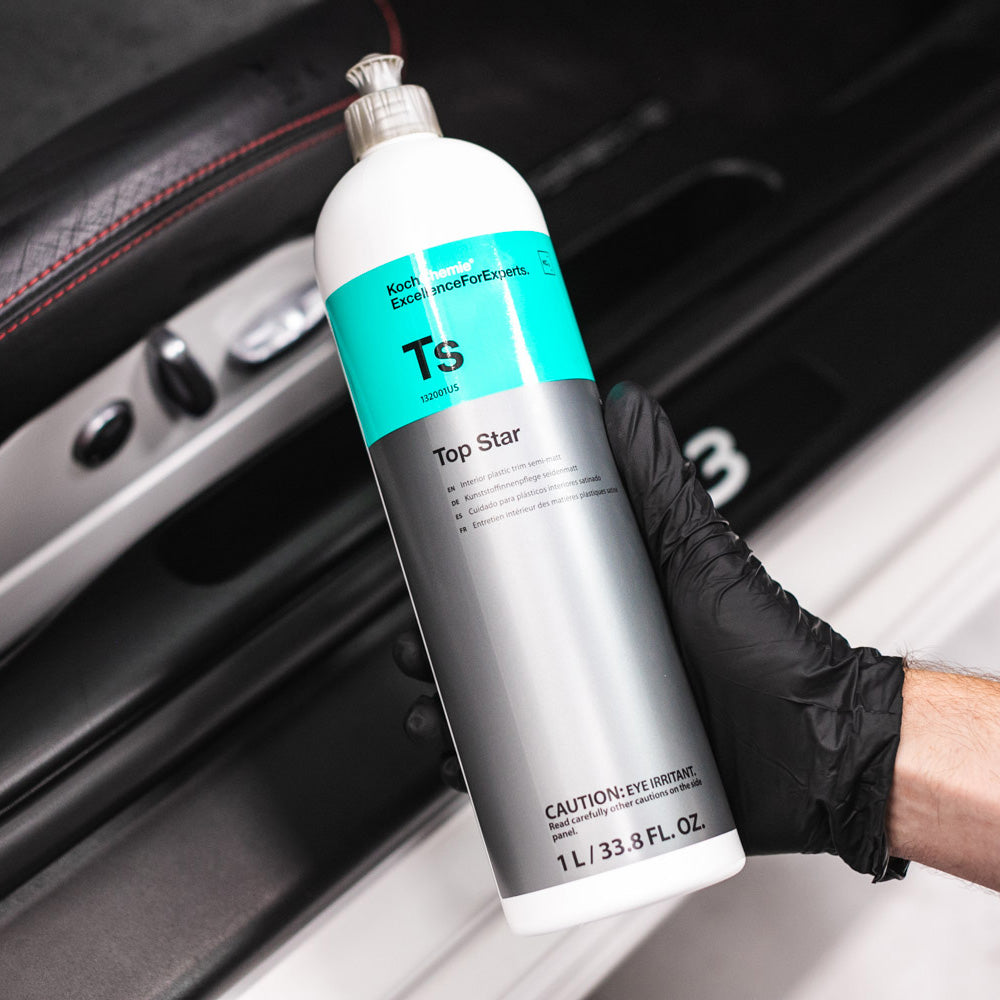 Top Star (Ts) is a premium care emulsion designed for deep cleaning and refreshing plastic and rubber surfaces including consoles, interior trim, and seals. It leaves a long-lasting, semi-gloss natural sheen while providing continuous protection against dirt and UV damage. Special active ingredients keep plastics flexible, reduce static buildup, and restore a fresh, attractive appearance. The product delivers a pleasant fragrance and is trusted with Daimler approval for professional quality results.