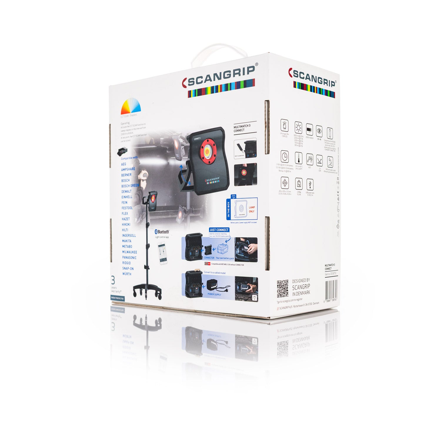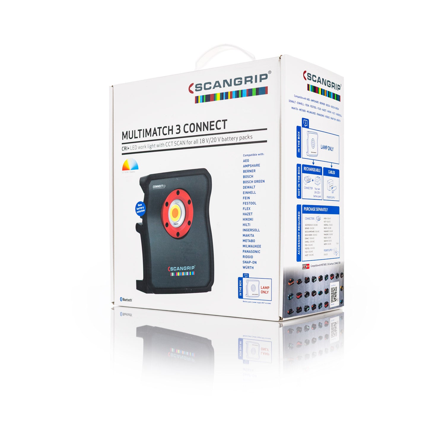The Multimatch 3 Connect is a powerful work light that delivers up to 3000 lumen, making it ideal for inspecting large surfaces during polishing, painting, cleaning, and color matching tasks. It is compatible with all 18V and 20V battery packs from leading power tool brands using the Scangrip connector. For uninterrupted operation, the power supply connect allows for direct power access, ensuring continuous light when needed.