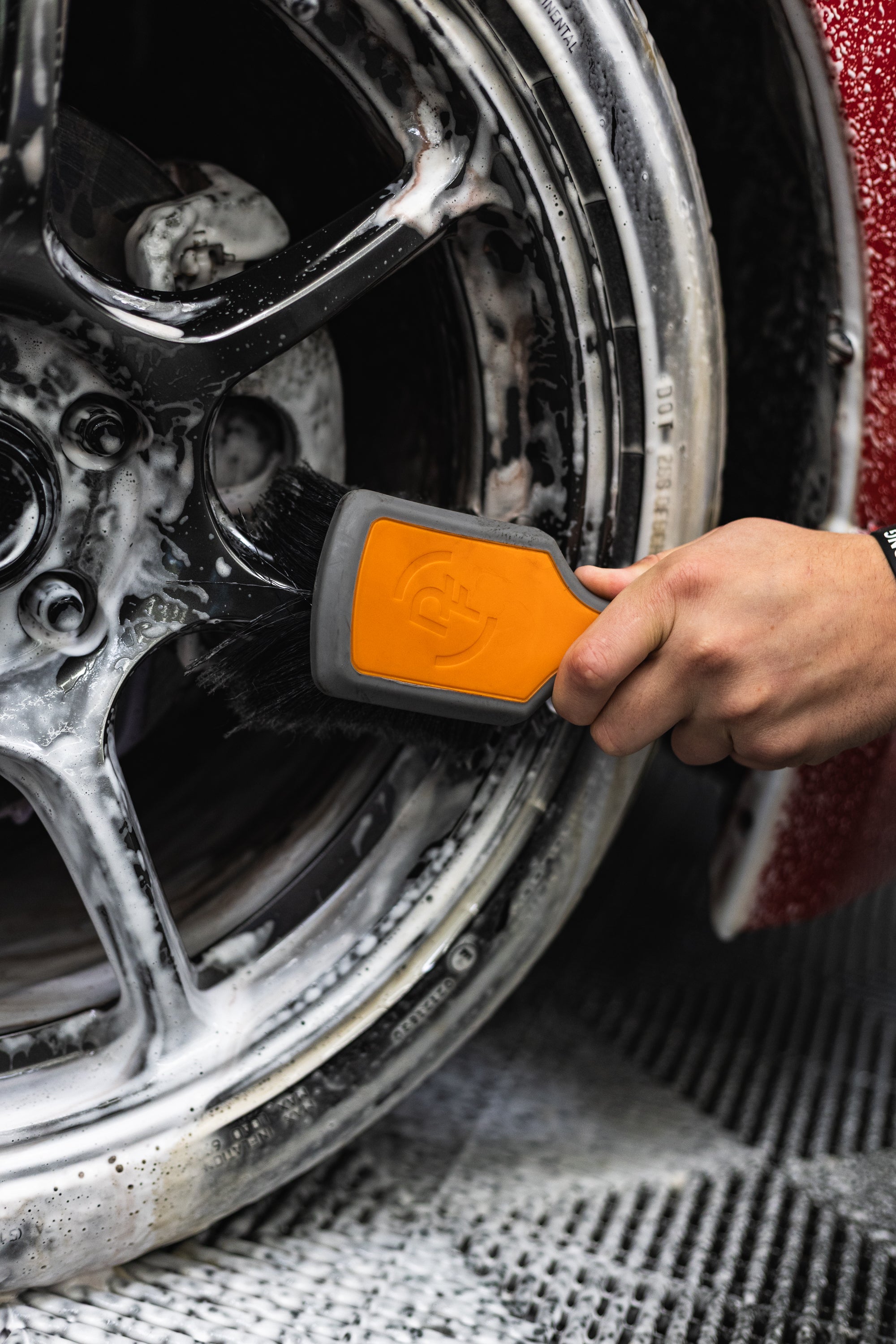 Part of our ProGrip line, features a comfortable and ergonomic handle design with rubber over-molding. Our wheel face brush sports flagged-tip bristles, meaning the tips of the bristles have been mechanically distressed to make them softer. This both prevents scratching and creates more lather during use. The chemical-resistant bristles are also flared to cover more area and get the job done faster.